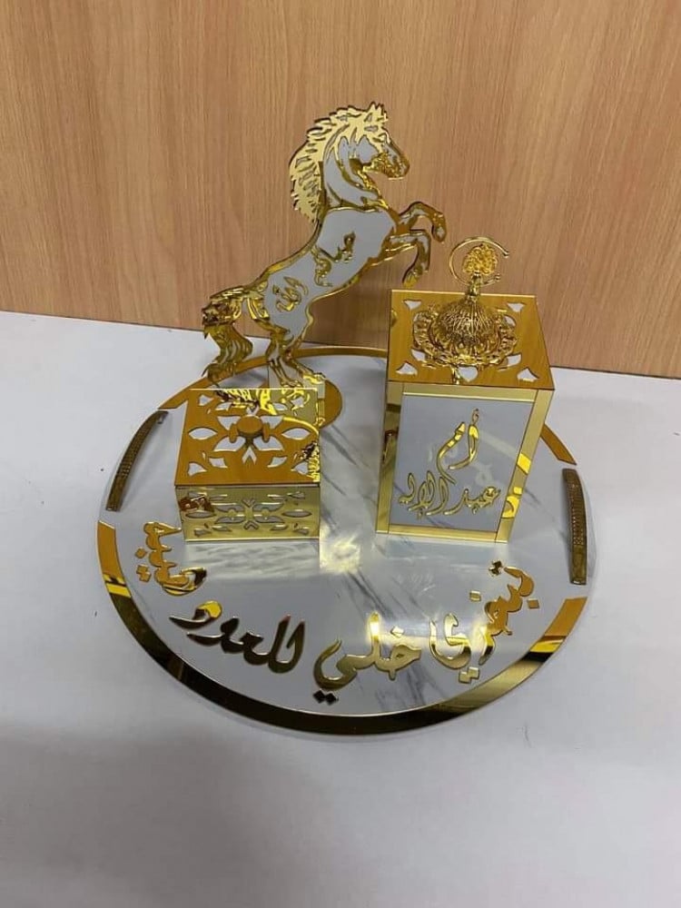 •يتكون الطقم من (مبخره بالاسم + علبه البخور + استاند دائري + صينيه)